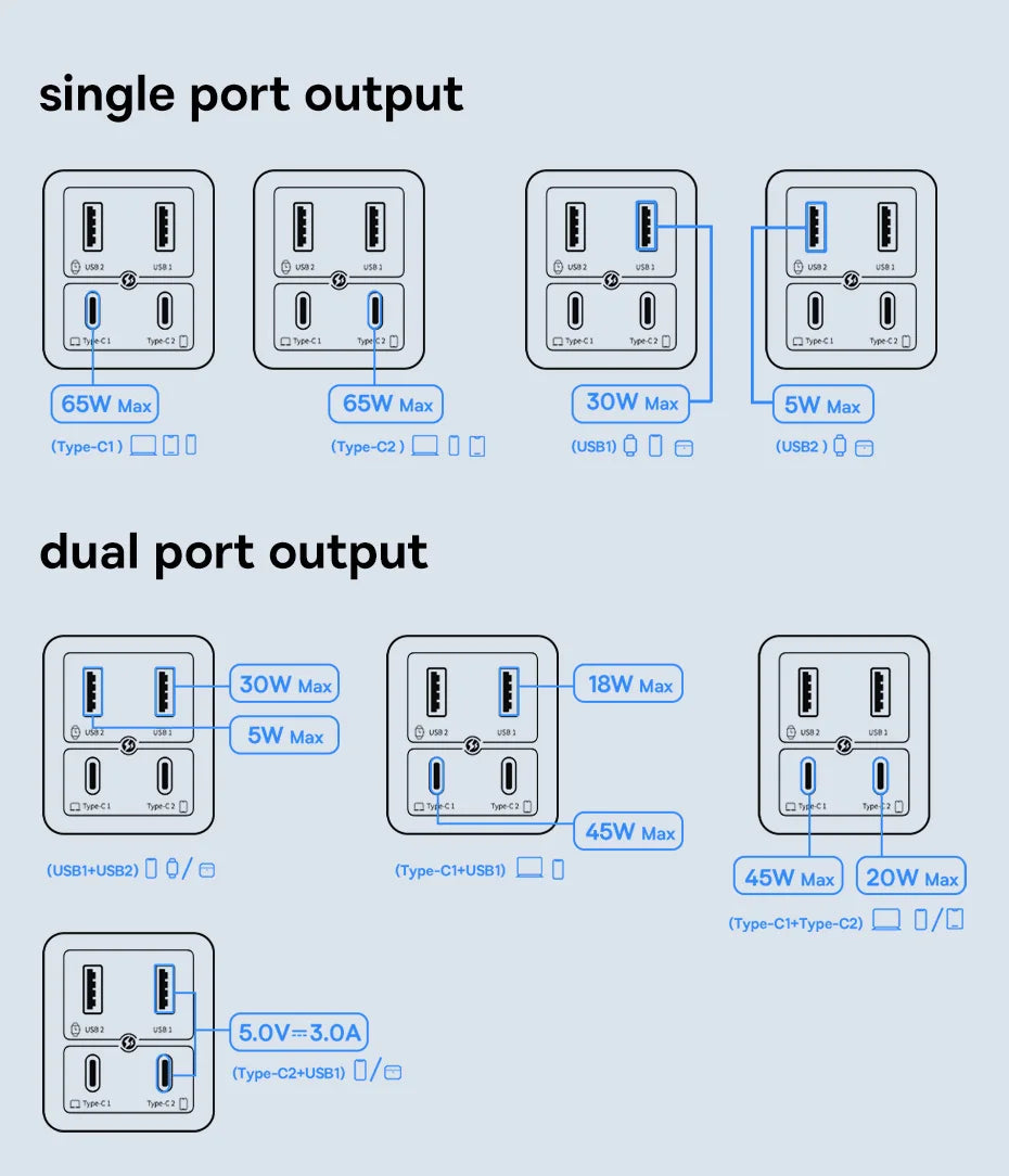 Type-C 1/2 65W Output: 5V/3A,9V/3A,12V/3A,15V/3A,20V/3.25A 65W Max